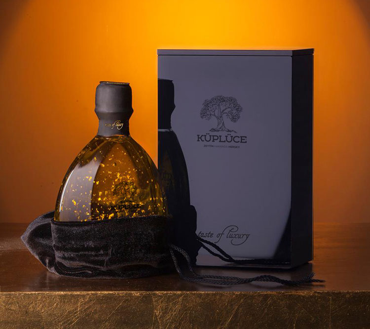 Özel şişesinde ve en özel zeytinyağı ile altın parçacıkları birleştirilir.